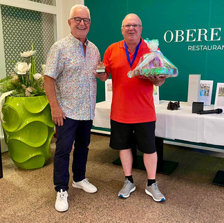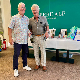 Der Rest ist Freude, Gratulation, Trost und Aufmunterung, gefolgt von Apéro, Nachtessen, Rangverkündigung und viel Spaß mit Freunden. Die grünen Bananen sind vergessen, es lebe das fehlende Wachtelei (dafür gab's eines vom Huhn), der Greyerzer-Käse war etwas knapp bemessen und die "alte Pflaume oder Zwetschge" fehlte auch. Egal, es schmeckte trotzdem und getrunken wurden 90 L Flüssigkeit. Die feine Magnum Abadia Retuerta Selecion Especial gewann Rolf Müller. Meister Uwe Lenz holte seinen Wanderpreis und sonstigen Gaben unter großem Applaus ab. Gespielt wurde allgemein sehr gut, das zeigen die vielen HCP Verbesserungen. Das warme Wetter (Seniorenwetter) nötigte einigen Kollegen einiges ab und konnte nur dank kühler Tranksame wieder ausgeglichen werden.